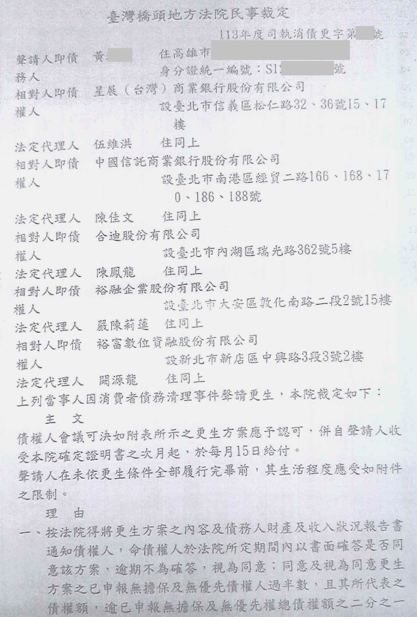 高雄黃先生來電詢問關於更生條件、法院更生、債務更生等問題,現在任職作業員,由於投資失利連帶自己也債務纏身,至今累積高達211萬根本無力償還,其後黃先生透過本會的協助輔導向法院聲請「債務更生」,並且更生條件符合成功核准僅需清償約29萬即可,未來可以安心工作回歸正常生活,恭喜沈先生!!!!