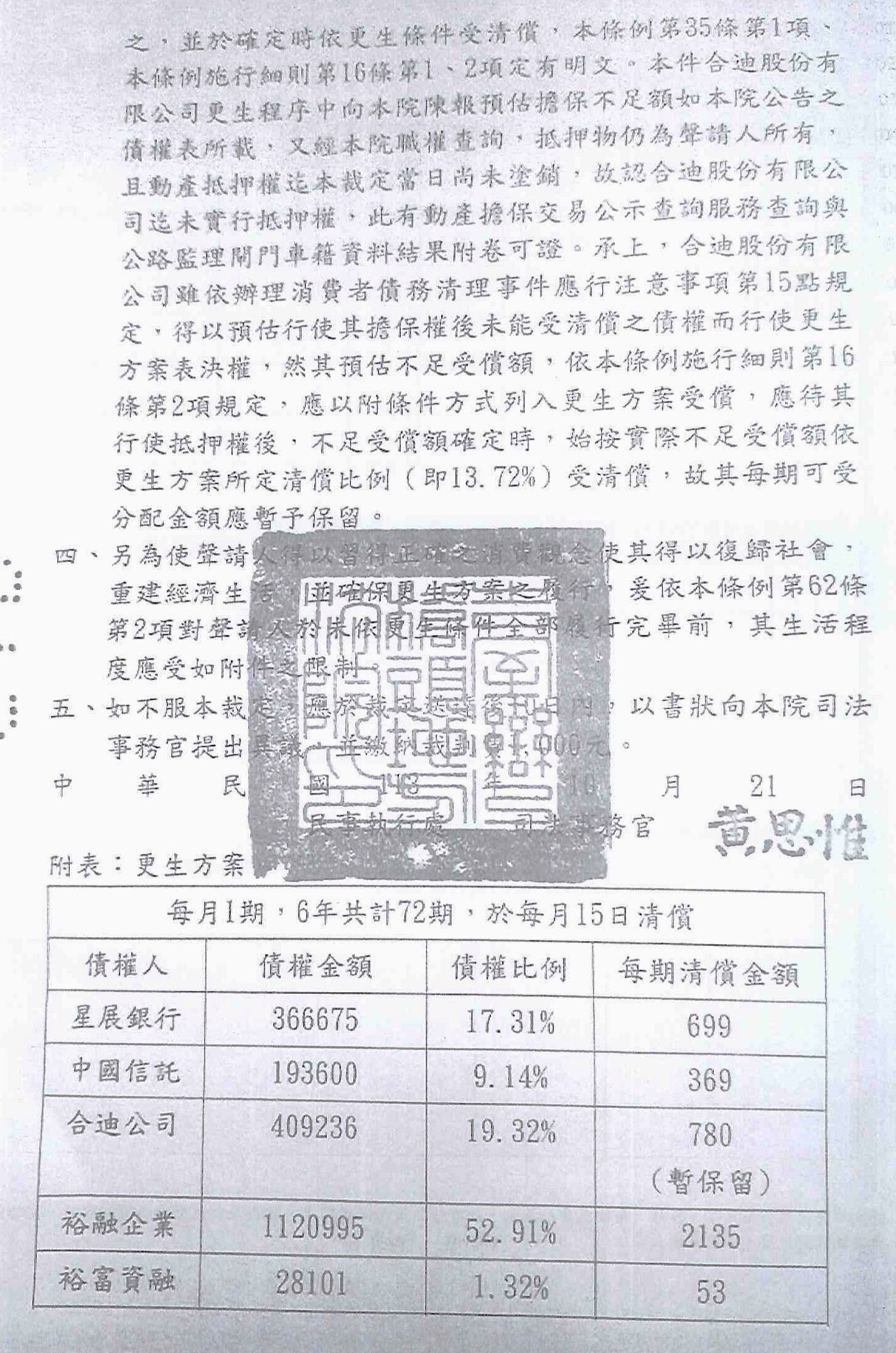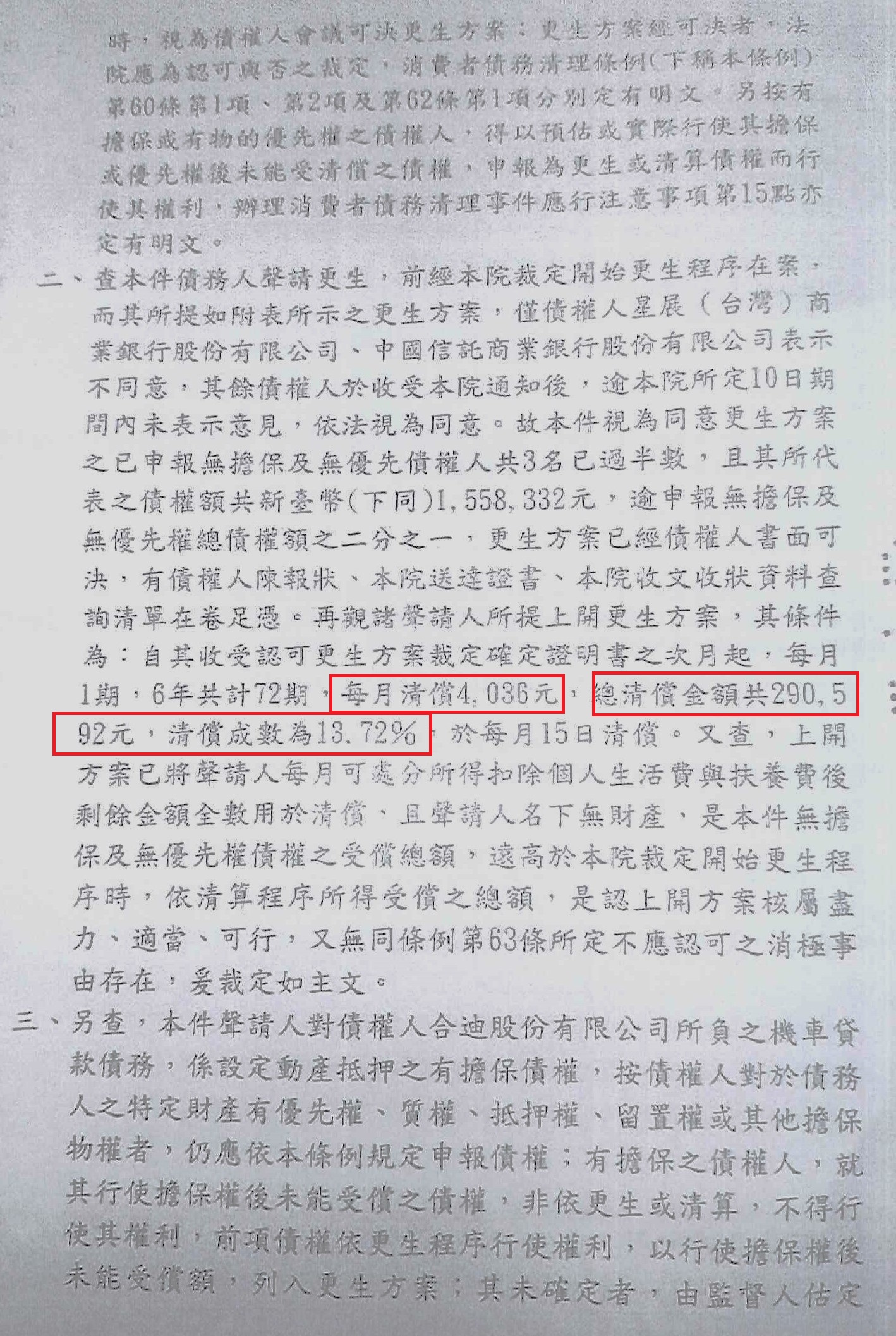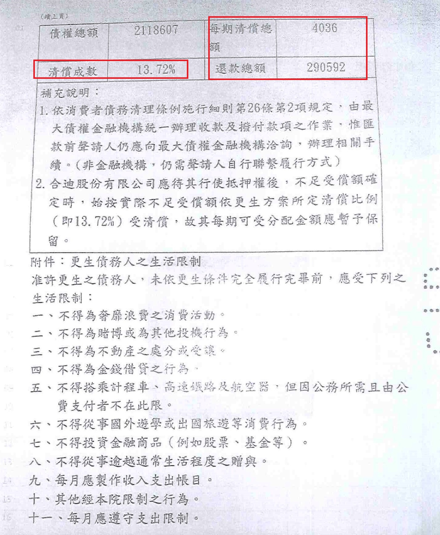 更生後清償比例:約13.72%