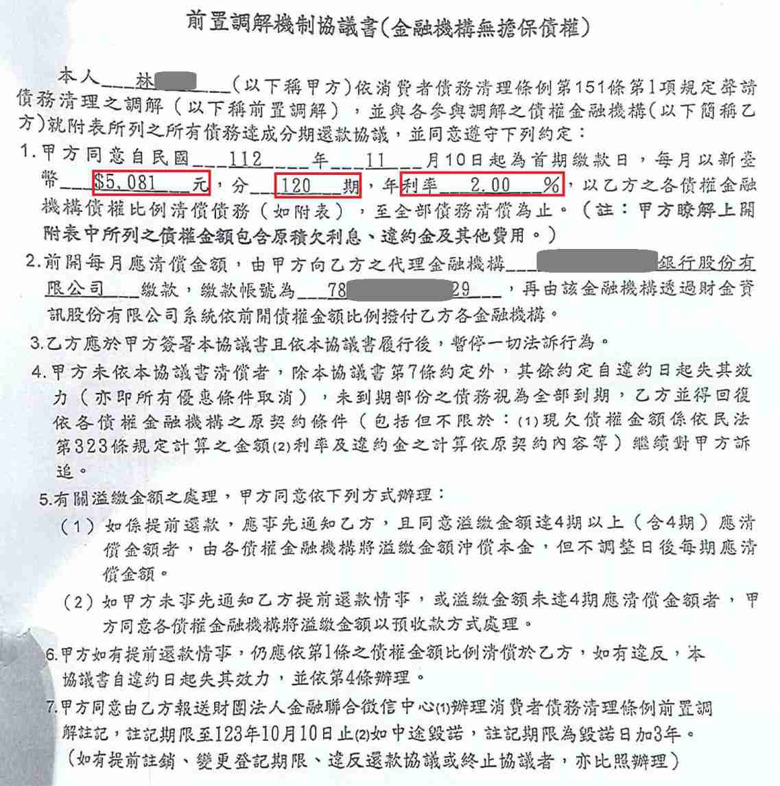 凱基商業銀行債務前置調解,橋頭地院核准減免利息至0%,分180期月繳4303元