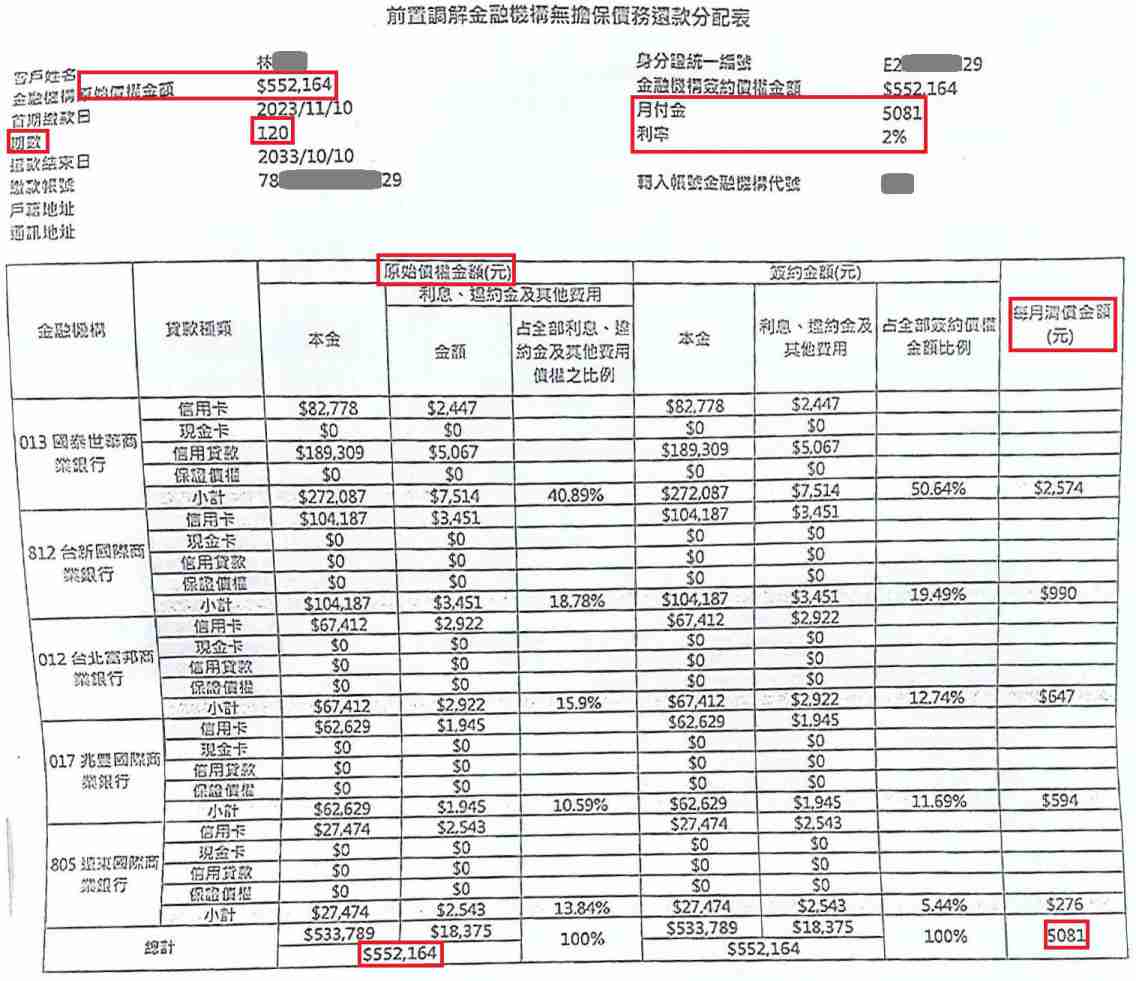 花旗銀行債務協商機制前置協商核准60期利息減免至0%月繳2953元