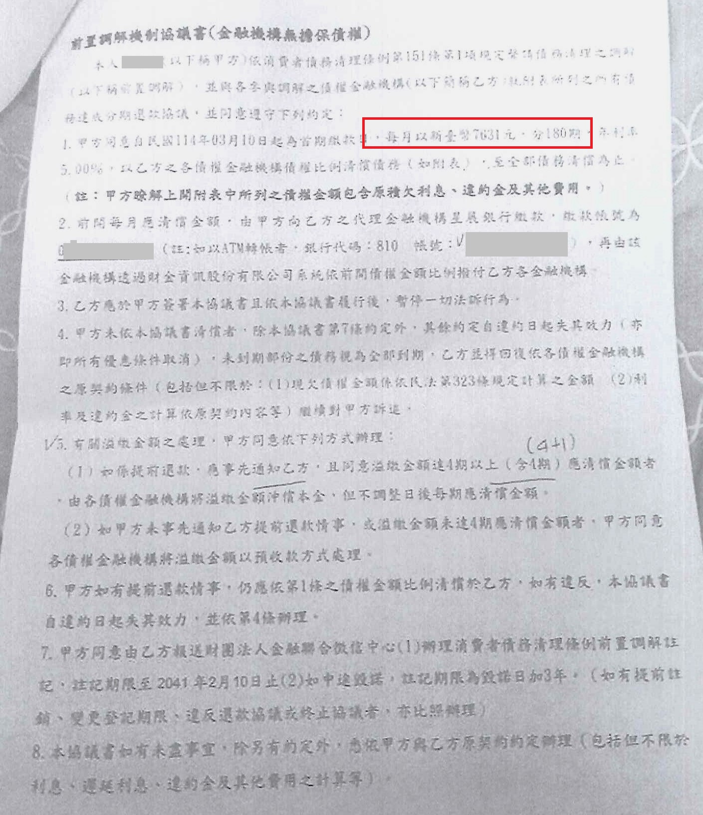 梁先生現任職作業員,因健康因素加上獨自撫養2名子女,一直以來家中經濟也是入不敷出,再負債不斷積累的情況下徹底爆發已無力償還,其後梁先生透過本會的協助輔導進行「法院前置調解」,經法院調解後取得180期5%利率月繳7631元的清償方案成功整合信用卡負債,恭喜梁先生!!!