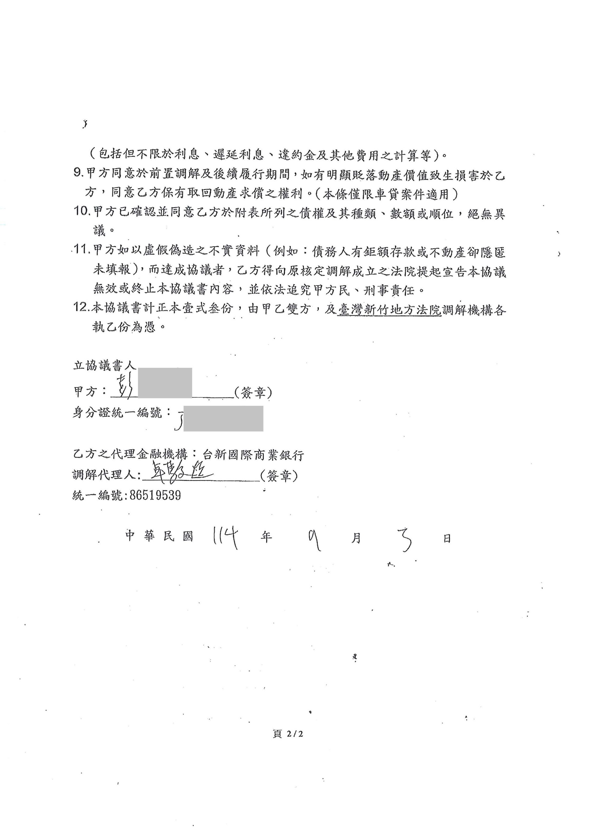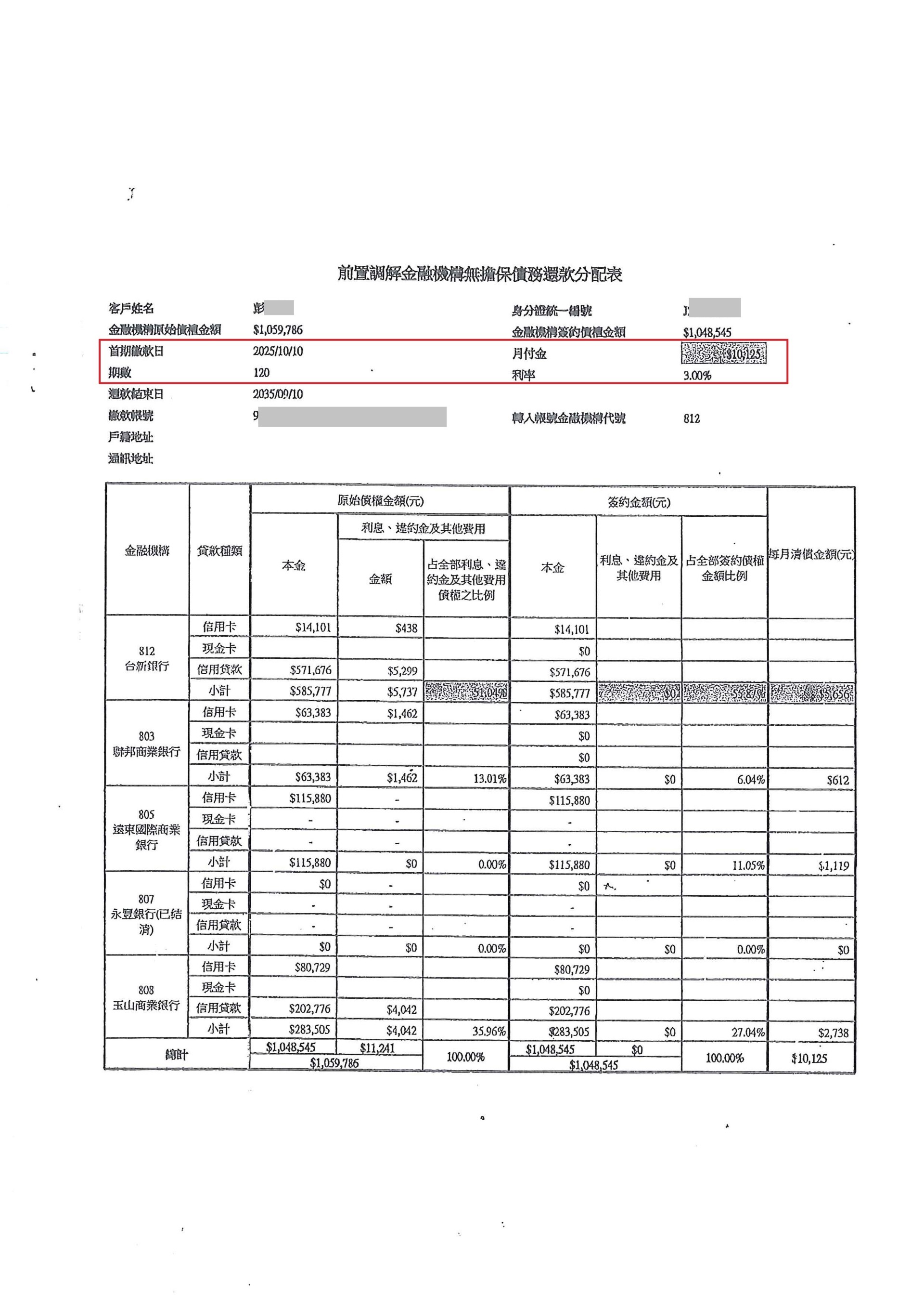 彭小姐因扶養小孩生活開銷大,從原先的小額借貸及卡費也因利息越滾越多,彭小姐為了避免負債持續擴大尋求協會的幫助,與銀行進行「前置調解」,經法院前置調解流程後取得120期3%利率月繳10,125元的清償方案成功解決債務問題,恭喜彭小姐!!!