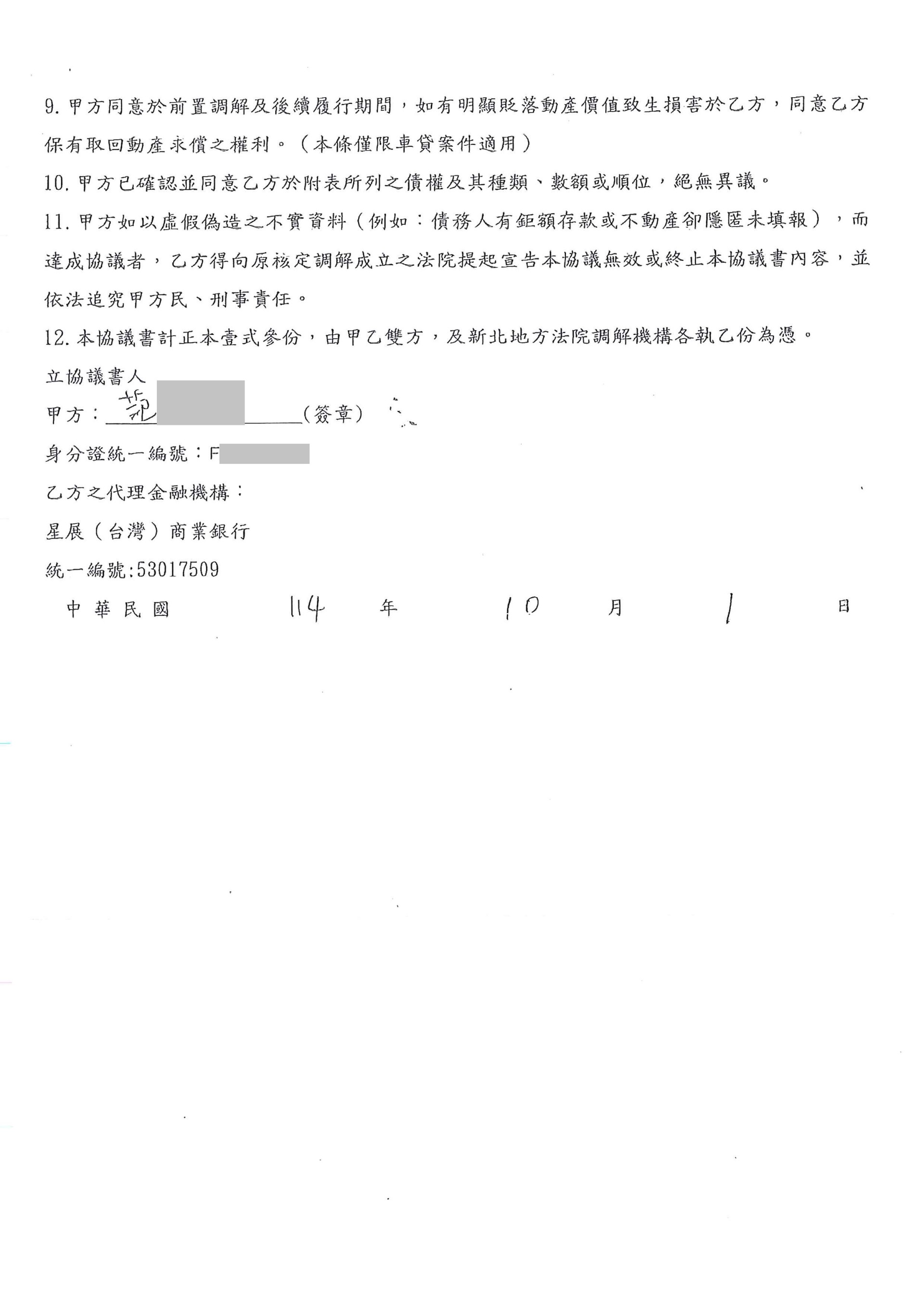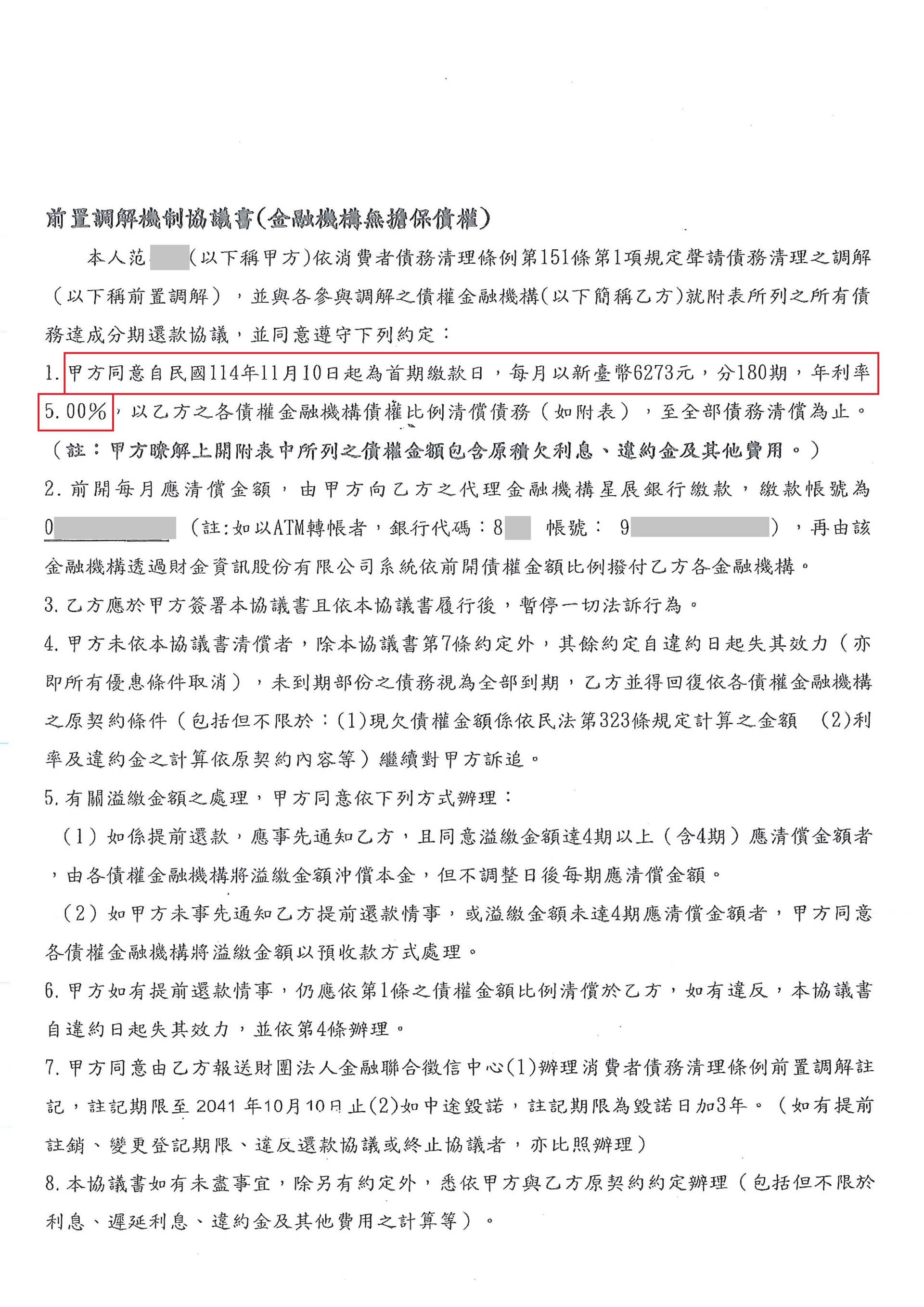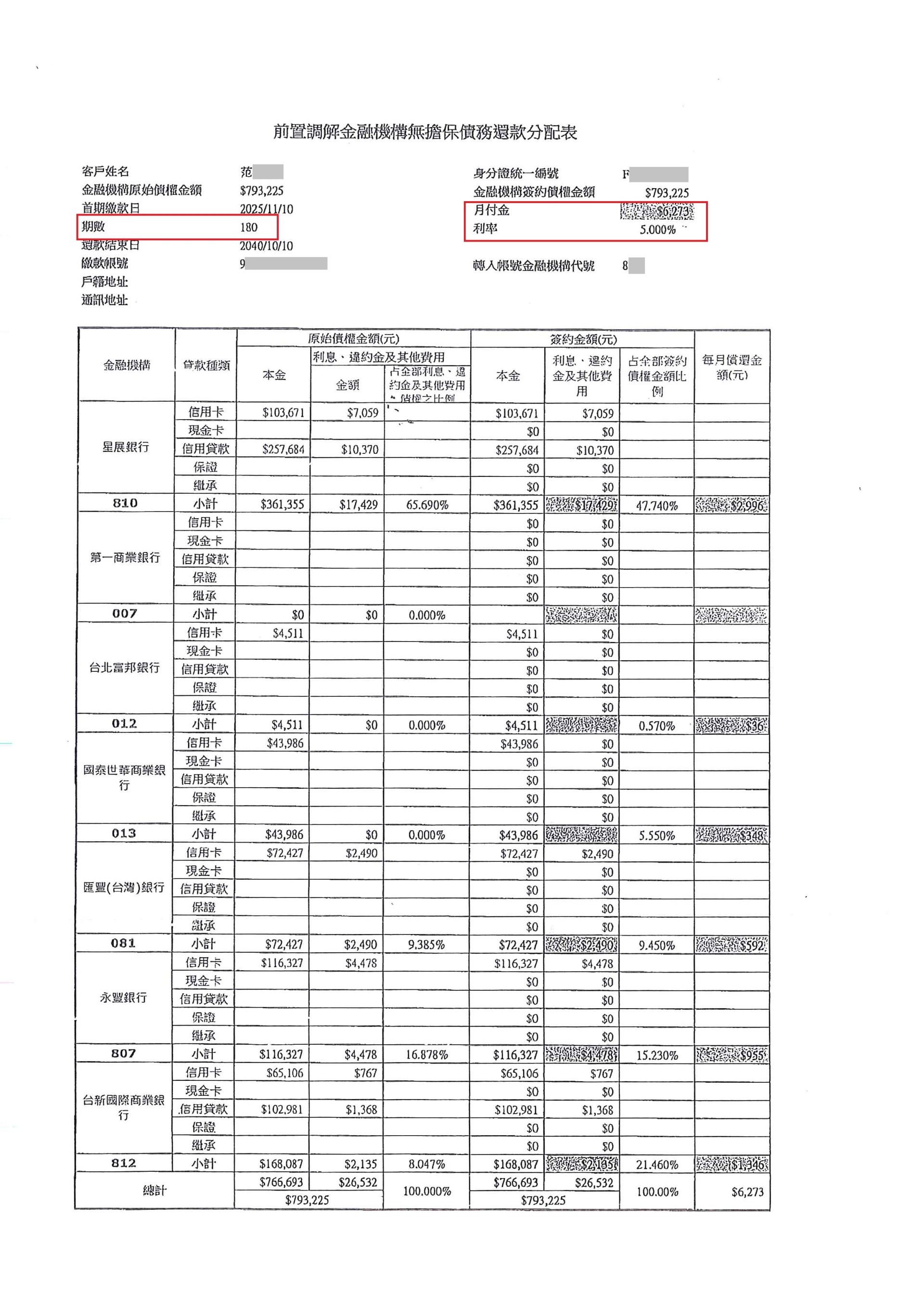 范小姐因長期扶養母親跟家中小孩開銷導致不堪負荷積欠高額債務,僅能依靠信用卡跟小額借貸勉強生活,范小姐為了避免負債持續擴大尋求協會的幫助,與銀行進行「前置調解」,經法院前置調解流程後取得180期5%利率月繳6,273元的清償方案成功解決債務問題,恭喜范小姐!!!