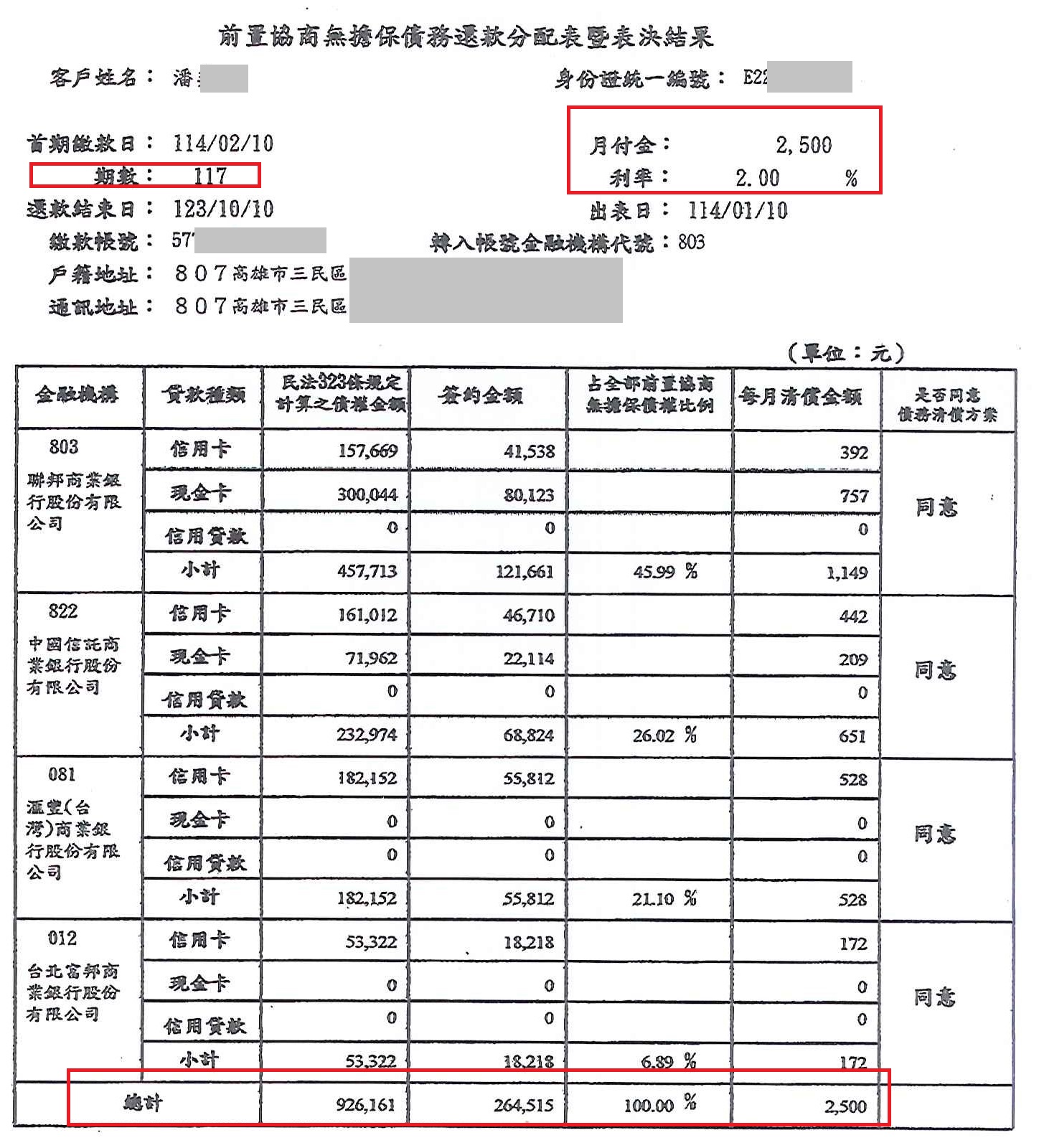 屏東地院債務更生成功核准,總債務約294萬,僅償還約32萬